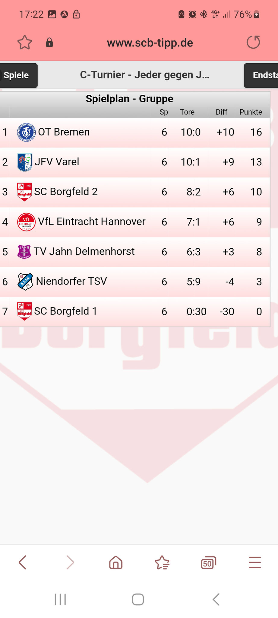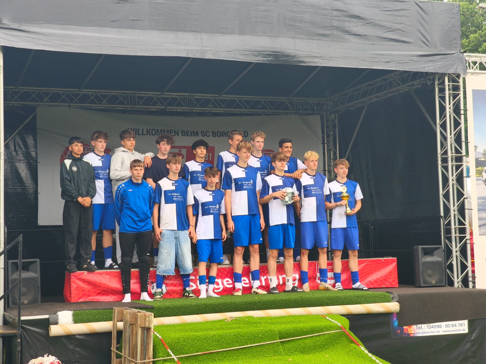 Turnier in Borgfeld: Am 28.6. traten wir die Fahrt zum Turnier nach Borgfeld an. Wir meldeten uns diesmal in der höheren Staffel 2 an, um uns auch körperlich und spielerisch zu fordern, das Wetter war super und die Stimmung hervorragend. Das erste Spiel ging gleich gegen die ältere B-Mannschaft vom Borgfeld, welche aber ohne Wertung spielte. Wir machten ein super Spiel und erkämpften uns ein 0:0 gegen einen starken Gegner. Dann verloren wir das zweite Spiel aufgrund mangelnder Chancenverwertung und einer Unachtsamkeit in der Hintermannschaft. Die folgenden 3 Spiele im Modus jeder gegen jeden konnten wir zu unseren Gunsten gestalten und holten 7Punkte. Das langt um einen hervorragenden 2.Platz hier beim tollen Turnier in Borgfeld zu erreichen.
