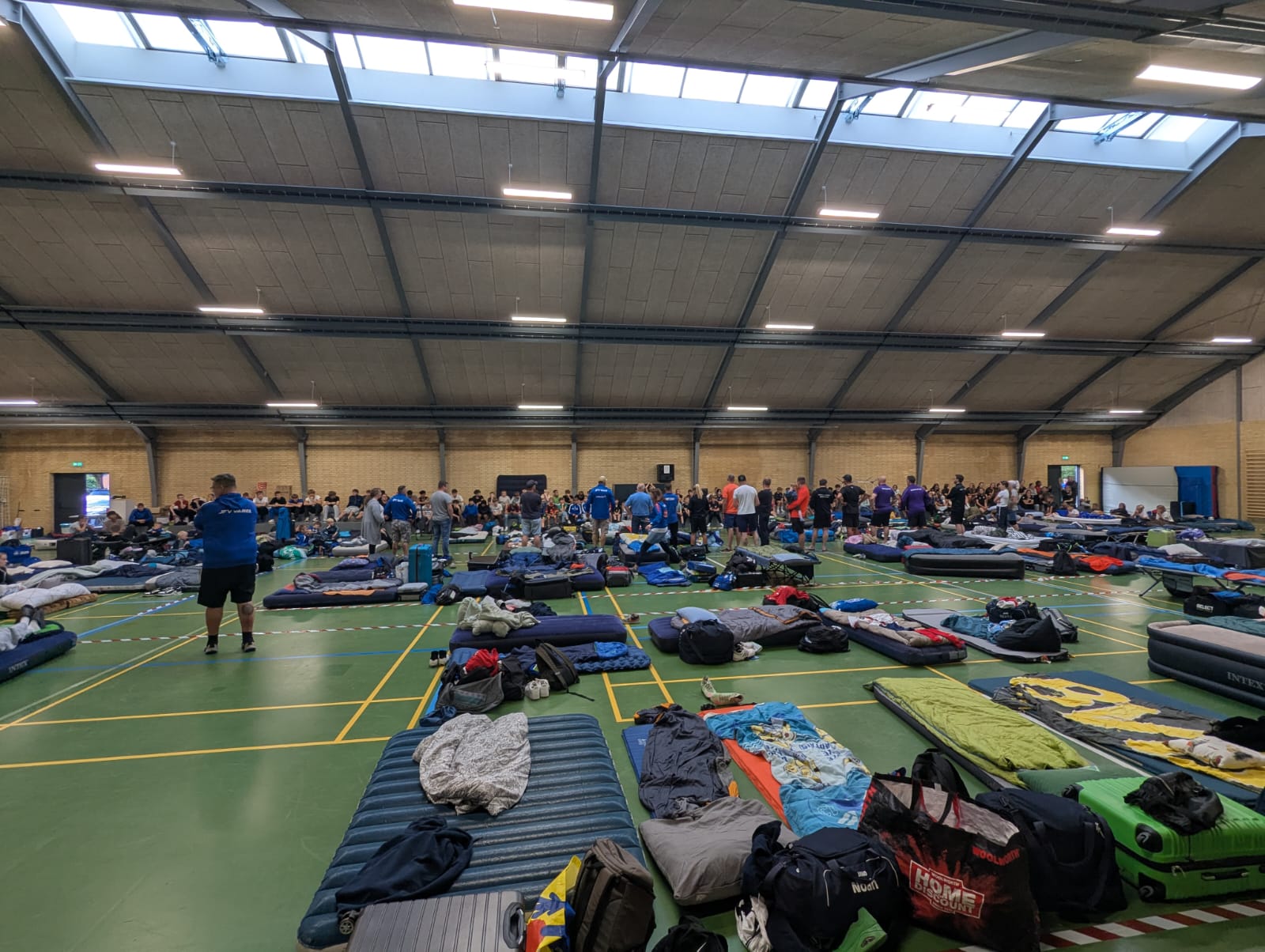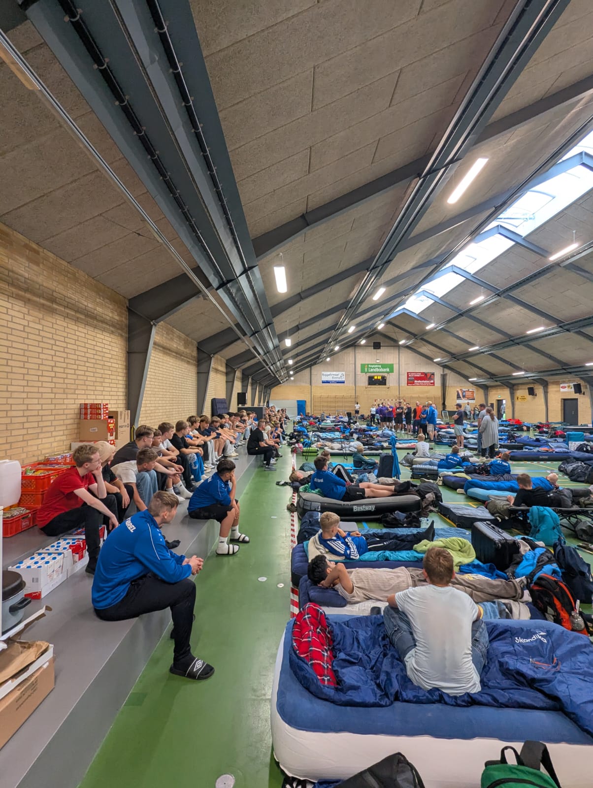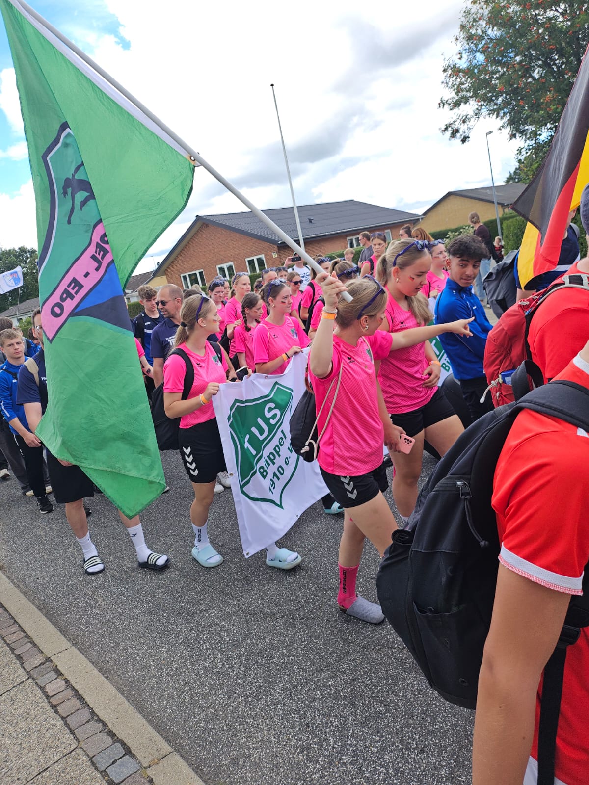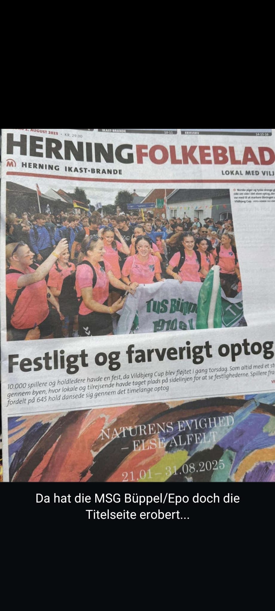 Gegen Mittag dann war sammeln auf einem Platz, von wo aus es im großem Marsch durch die Stadt ging und gefühlt alle Einwohner von der Seite einem zujubeln, schon beeindruckend und eine tolle Atmosphäre. An üblicher Stelle dann, haben wir wieder unsere Humba gemacht und es diesmal sogar auf die Titelseite der Dänischen Zeitung geschafft. Nach der Begrüßung im Stadion von Vildbjerg ging es dann endlich um 15Uhr los mit den Spielen.