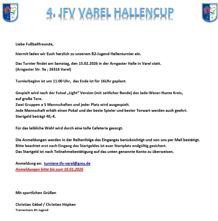 Einladungsschreiben JFV Varel Hallenturnier in der Arngaster Halle am 15.2.2026